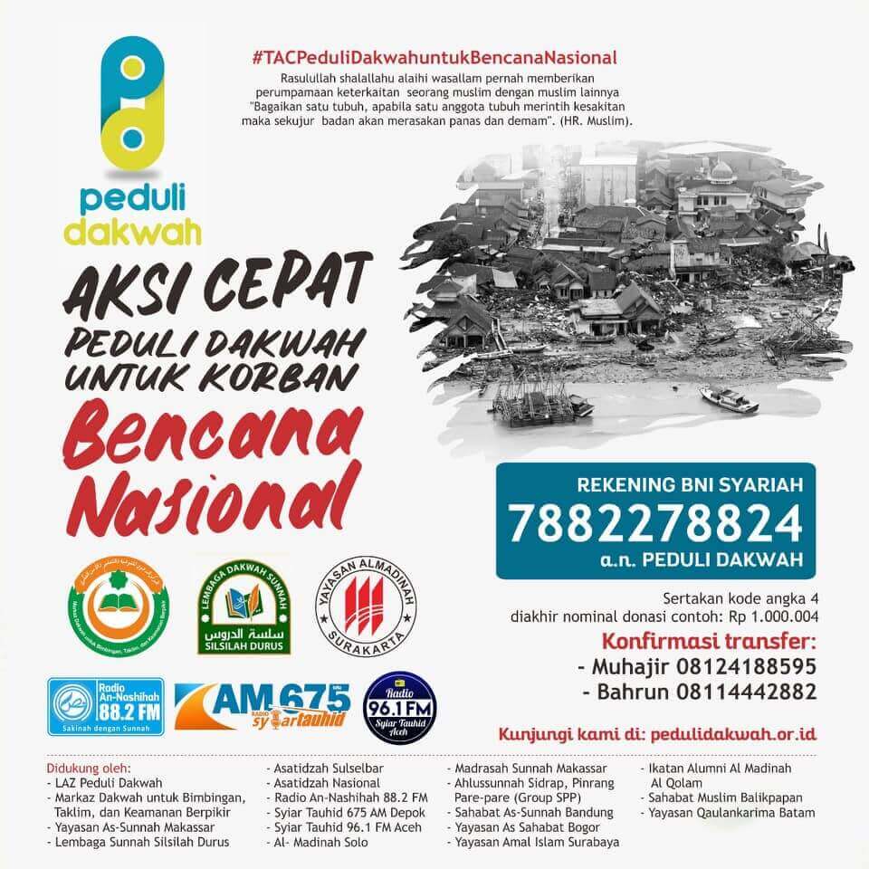 Alhamdulillah, atas izin dan kemudahan dari Allah, kami dari Peduli Dakwah (Yang tergabung didalamnya Yayasan As-Sunnah Mks, Asatidzah Nasional, Asatidzah Sulselbar, dll) telah diberikan kesempatan oleh Allah untuk membantu saudara-saudara kita yang mengalami bencana. Program-program bantuan, baik materi maupun dakwah terus berjalan sampai saat ini. Bantuan ta’awun dari kaum muslimin sangat membantu kami dalam menjalankan program. Tim dari Peduli Dakwah dalam beberapa waktu terakhir terfokus untuk menyelesaikan Pembangunan Masjid Mahad As-Sunnah dan Rumah Hunian Sementara yang akan ditempati Asatidzah Pengajar, masyarakat dan keluarganya dalam menuntut ilmu islam di Sembalun Lombok NTB, Program Perbaikan Masjid, Pembangunan Ponpes dan rumah belajar, Pengadaan Air Bersih (RO) untuk dibagikan ke masayarakat berjalan terus, Pengadaan Buku-buku Islam di Sulteng, Pemberian Logistik dan Pencerahan Kalbu melalui Dakwah ilallah di Banten-Lampung, dan Logistik untuk saudara-saudara yang mengalami tanah longsor di Sukabumi Jabar.