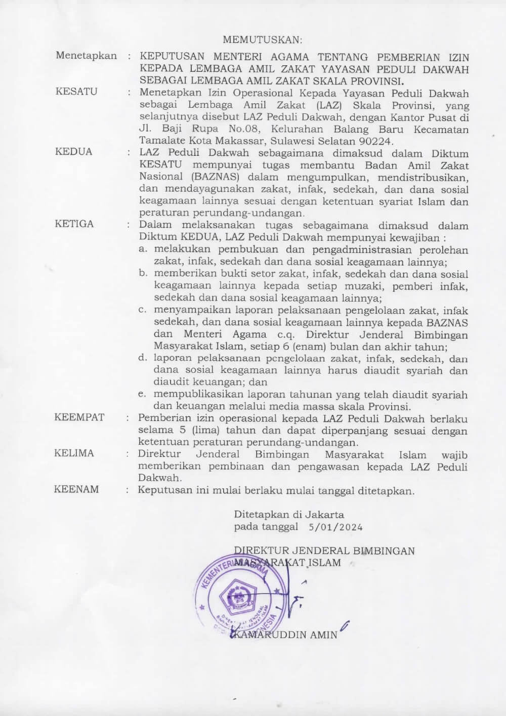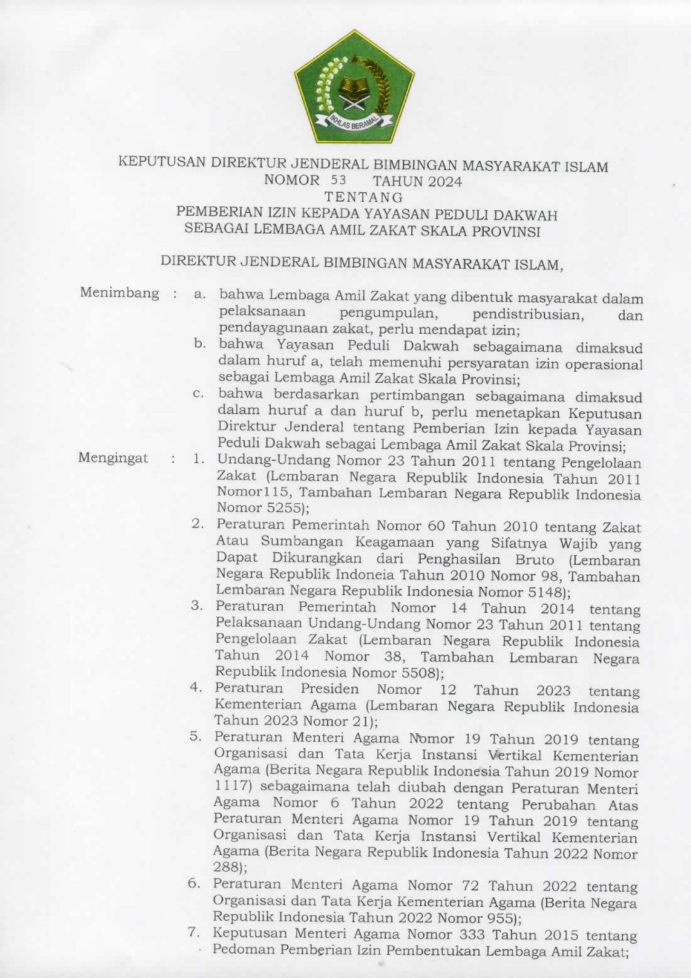 • SK Ditjen Bimas Islam Kemenag RI No. 53 Tahun 2024 Sebagai LAZ Provinsi