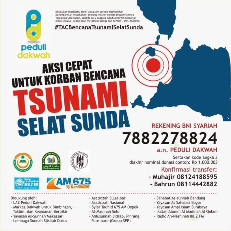 ⏩ Oleh sebab itulah kami yang tergabung dalam TIM AKSI CEPAT untuk KORBAN BENCANA TSUNAMI SELAT SUNDA” dengan menggugah hati kaum muslimin & muslimat untuk ikut merasakan dan peduli terhadap musibah yang menimpa saudara kita di Cinangka, Anyer Banten dan Bandar Lampung.