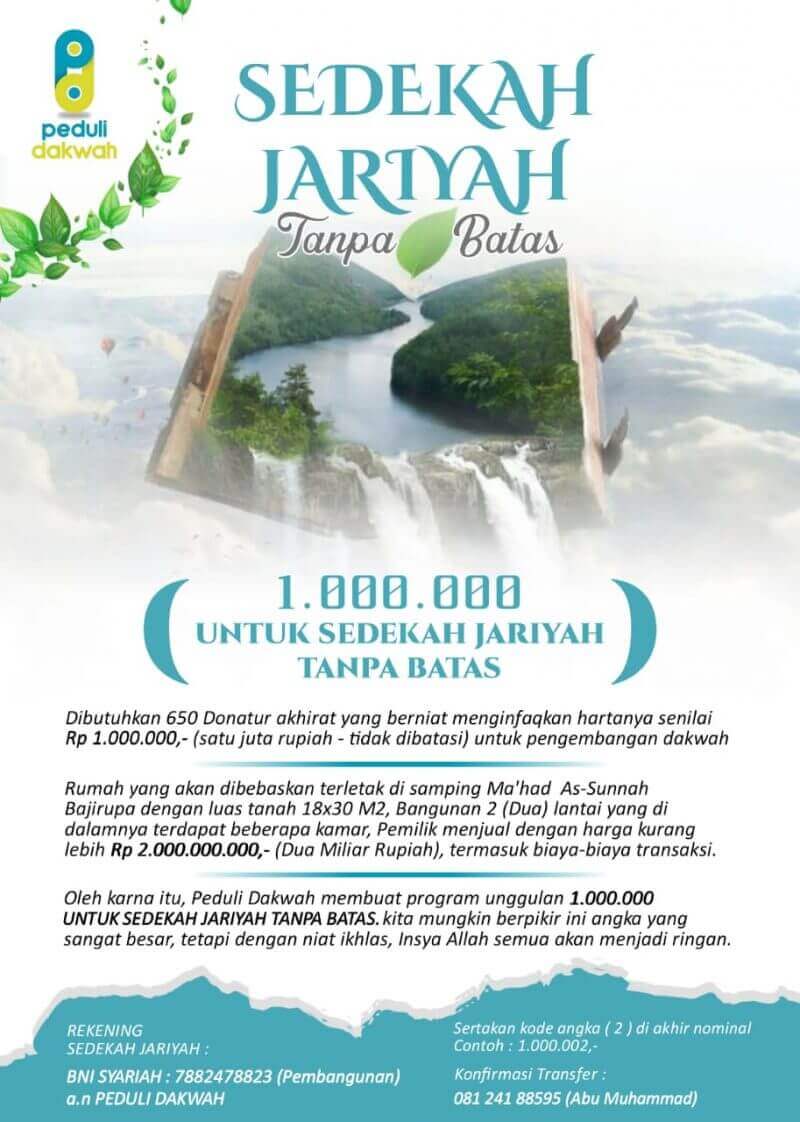 SEDEKAH JARIYAH TANPA BATAS adalah salah satu program unggulan dari PEDULI DAKWAH yang dikhususkan untuk membebaskan Rumah samping Ma’had As-Sunnah Makassar dalam rangka pengembangan dakwah. Insya Allah program ini akan segera berakhir karena batas waktu yang diberikan oleh pemilik rumah sudah akan berakhir yaitu Jum’at, 29 Maret 2019.