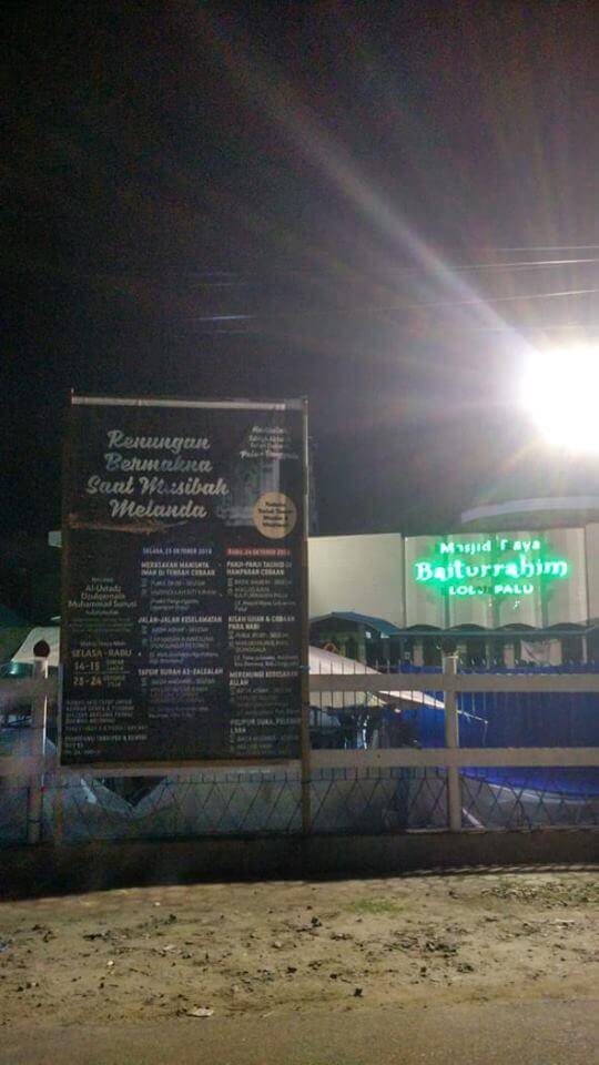 (05:14 WITA) Muhajir: Taushiyah Umum di Masjid Raya Baiturrahim Palu, bersama Ustadz Dzulqarnain Muhammad Sunusi, nampak beberapa warga berantusias hadir untuk mendengarkan taushiyah tersebut, semoga menambah keimanan mereka kepada Allah Ta’ala pasca gempa dan tsunami yang melanda Palu.